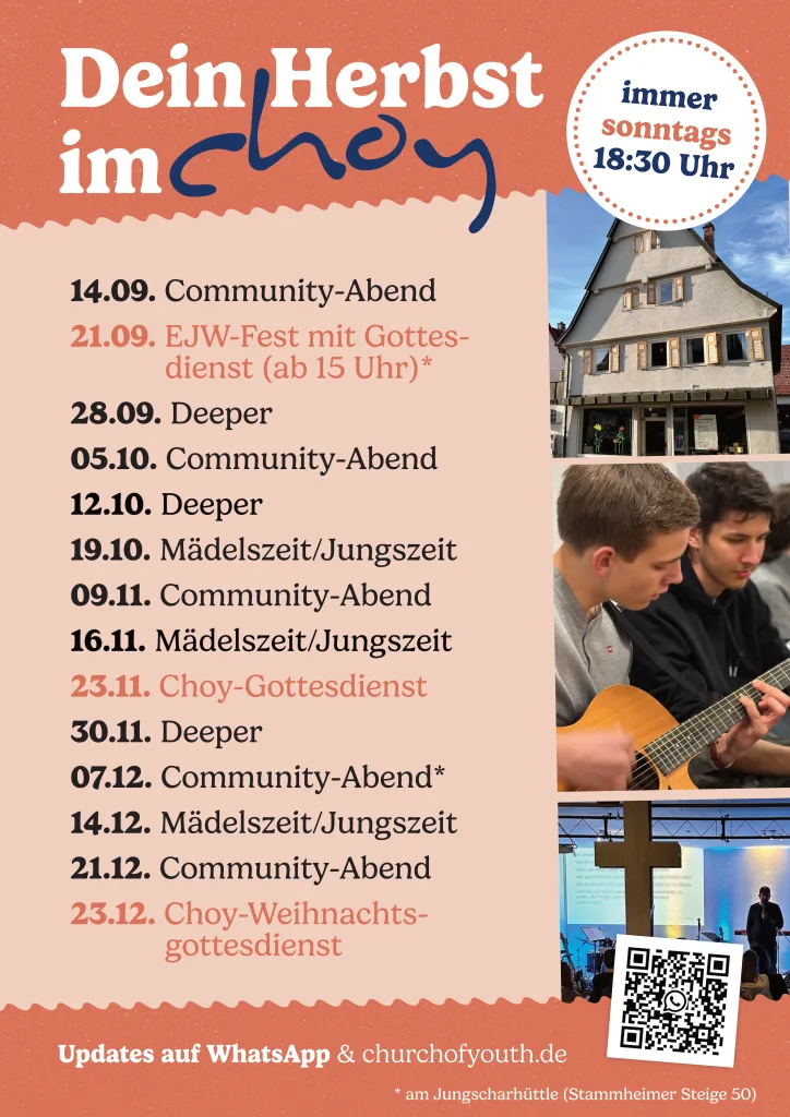 Aktuelle Informationen, Programmangebote und Termine finden sich auf der CHOY-Homepage www.churchofyouth.de