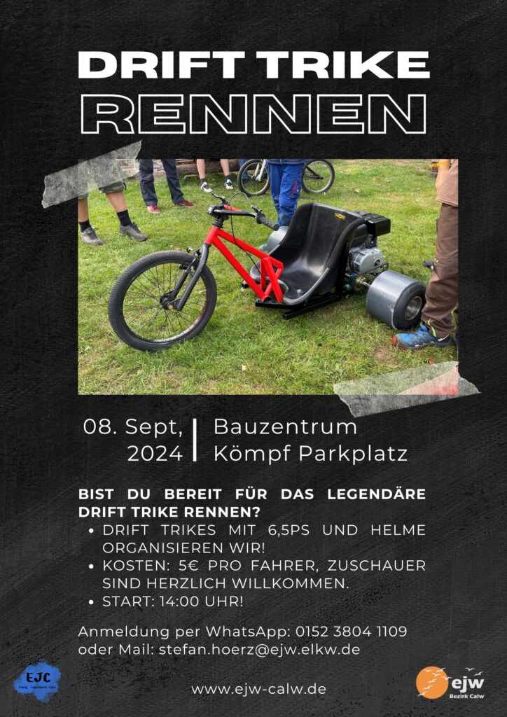 Die Anmeldung zum Drift Trike Rennen erfolgt über Stefan Hörz. Interessierte können sich per E-Mail unter stefan.hoerz@ejw.elkw.de oder per WhatsApp (0152 3804 1109) anmelden.
