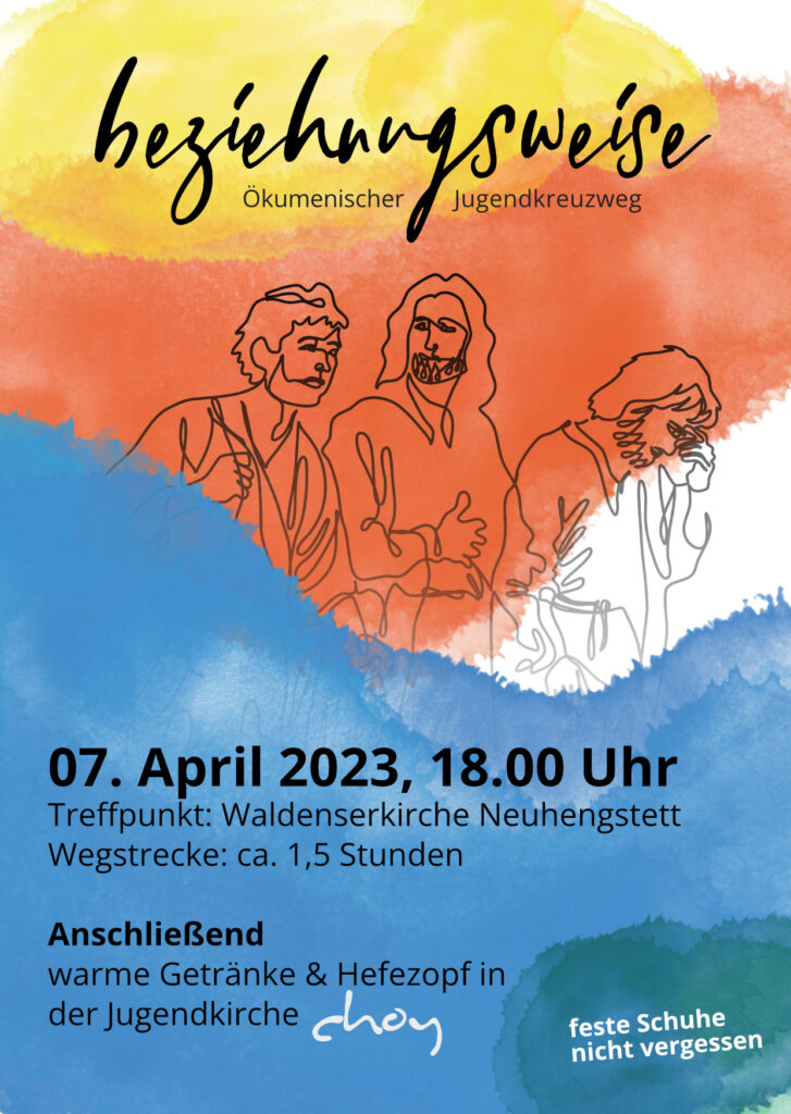 Jugendkreuzweg in Aktuelles aus dem Jugendwerk an 2. März 2023 Play Pause Unmute Mute Am 7. April veranstaltet die Choy Jugendkirche einen Ökumenischen Jugendkreuzweg. Los geht’s um 18:00 Uhr in der Waldenserkirche Neuhengstett. Im Anschluss gibts Snacks und etwas zum trinken. Vergesst eure festen Schuhe nicht.Wir freuen uns auf dich!