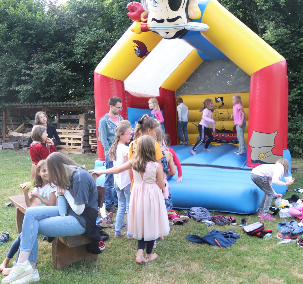 Am 01. Juli fand die diesjährige Jungschardisco statt. Wir blicken freudig und dankbar auf einen genialen Abend zurück, den wir mit etwa 150 Kindern und 40 Mitarbeiter*innen erleben durften. Der Abend hatte das Motto „Sommerparty“ und fand im Freien beim Calwer Jungscharhüttle statt. Das Gelände wurde sommerlich geschmückt und mit allerlei Spielangeboten ausgestattet. Außerdem gab es eine Bar mit Leckereien und eine Tanzfläche. Zur Begrüßung erhielten die Jungscharler*innen einen Gutschein für einen gratis Saft-Cocktail, den viele gleich einlösten. Das Highlight der Kinder war die extra für den Abend aufgebaute Hüpfburg. Auch ein geistlicher Impuls durfte nicht fehlen. Samuel erzählte den Kindern von einem Schatz auf dem Acker und davon, dass sie in Gottes Augen der wertvollste Schatz überhaupt sind. Die Jungscharler*innen aus Althengstett, Simmozheim, Stammheim, Neuweiler, und Neubulach waren traurig, als das letzte Lied des Abends erklang und es mit dem Bus wieder in die Heimatorte ging. Gemeinsam wurde drei Stunden lang getanzt, gelacht und gespielt. Wir freuen uns jetzt schon auf die nächste Jungschardisco. Mal sehen, wo diese steigen wird.