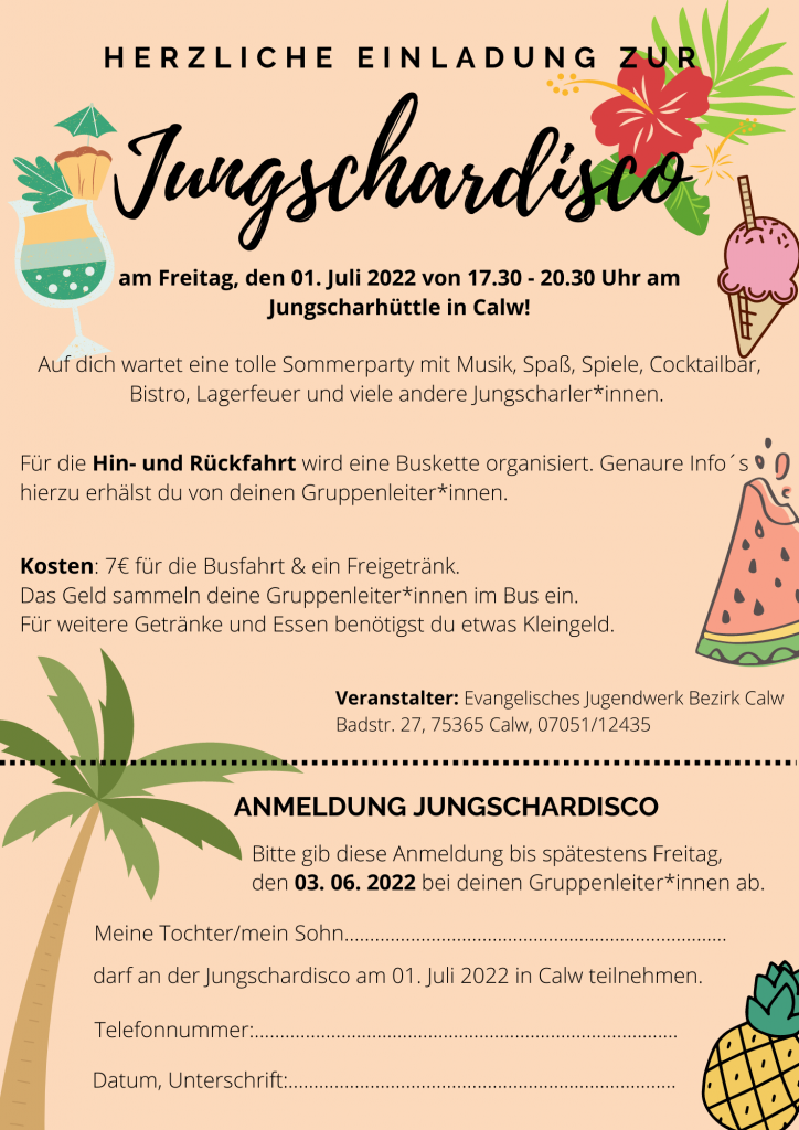 Jungschardisco in Aktuelles aus dem Jugendwerk an 11. Mai 2022 Play Pause Unmute Mute Wir sind froh, dass die Jungschardisco dieses Jahr wieder stattfinden kann. Alle Infos findest du hier! Wir freuen uns riesig, dass Jugendarbeit wieder so uneingeschränkt möglich ist, und möchten euch gerne zur diesjährigen Jungschardisco einladen.Sie findet dieses Jahr zu einer anderen Zeit im Sommer statt. Wir freuen uns, wenn ihr euch einladen lasst und mit dabei seid.Mehr Infos zur Kinderdisco findest du auf dem Flyer.