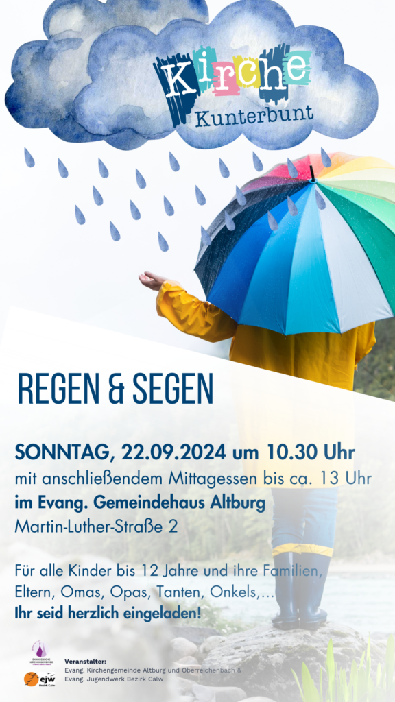 am Sonntag, den 22. September 2024 um 10:30 Uhr laden wir euch herzlich zur Kirche Kunterbunt ins evangelische Gemeindehaus Alburg (Martin-Luther-Straße 2) ein! Gemeinsam wollen wir unter dem Motto „Regen & Segen“ einen bunten und fröhlichen Tag erleben.