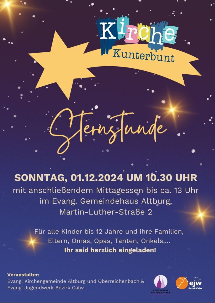 Kirche Kunterbunt 1.12.24 in Ausblick an 30. Oktober 2024 Play Pause Unmute Mute Herzliche Einladung zur Kirche Kunterbunt am 1.12.2024 in Altburg. Gottesdienst für die ganze Familie. Bist du dabei?