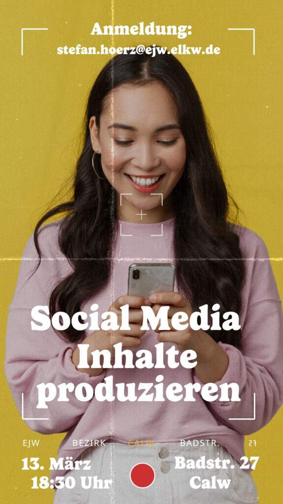 Wir freuen uns darauf, gemeinsam mit dir in die Welt der Social Media einzutauchen und neue kreative Möglichkeiten zu entdecken. Melde dich noch heute per Mail (Stefan.hoerz@ejw.elkw.de) an und sichere dir deinen Platz!