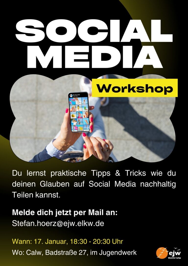 wir freuen uns, euch herzlich zu unserem Social Media Workshop einzuladen, der am 17. Januar 2024 um 18:30 Uhr oben im Jugendwerk (Badstraße 27, Calw) stattfinden wird. In einer digitalisierten Welt ist es entscheidend, die Chancen von Social Media zu nutzen, um als Christen, Jugendwerke oder Vereine präsent zu sein und eine positive Wirkung zu erzielen.