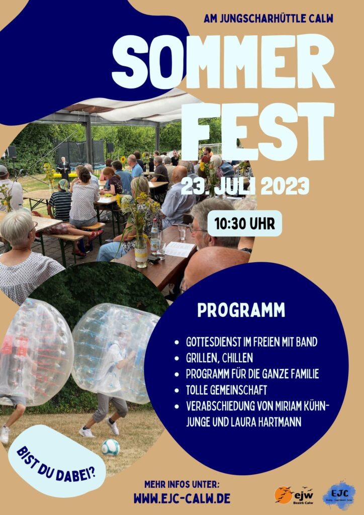Das Sommerfest findet am 23.07.2023 um 10:30 Uhr am Jungscharhüttle statt. Den Gottesdienst wird Roland Bühler predigen. Beim Gottesdienst wird Laura Hartmann und Miriam Kühn-Junge verabschiedet. Außerdem werden unsere Stara-Mitarbeiter mit einem Segen ausgesandt. Nach dem Gottesdienst grillen wir gemeinsam, essen Kaffee und Kuchen und genießen die gemeinsame Zeit. Für alle, denen chillen zu langweilig ist, haben wir Programm für jung und alt vorbereitet. Wir freuen uns auf dich.